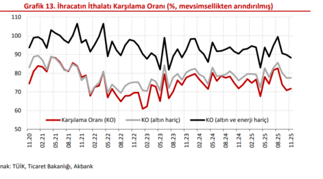 Ticaret Bakanlığı’nın geçici verilerine göre Kasım 2025’te dış ticaret açığı yıllık bazda 7,8 milyar dolar oldu. Altın ve enerji hariç ithalatın tüketim ve ara malları kanalıyla artması, çekirdek dengede bozulmaya işaret ederken iç talebin güçlü kaldığını gösteriyor. Mevsimsellikten arındırılmış verilerde sınırlı iyileşme olsa da açık 9 milyar dolar civarında seyrediyor. Enerji ve altın kalemlerinde kısmi iyileşme görülürken, çekirdek ithalattaki artış fiyat baskılarının sürdüğüne işaret ediyor.