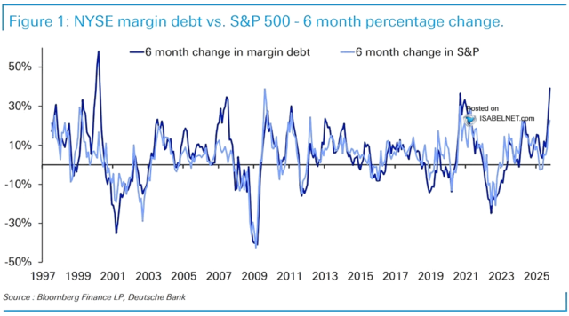 Paylaşılan ikinci grafikte, yaklaşık 30 yıllık döneme yayılan marjin borçlanmasının altı aylık değişimi ile S&P 500’ün altı aylık performansı neredeyse iç içe geçmiş bir görünüm sergiliyor. Bu ilişki, yatırımcıların piyasaya duyduğu güven düzeyi ile kaldıraç kullanımı arasında güçlü bir bağ olduğunu işaret ediyor.