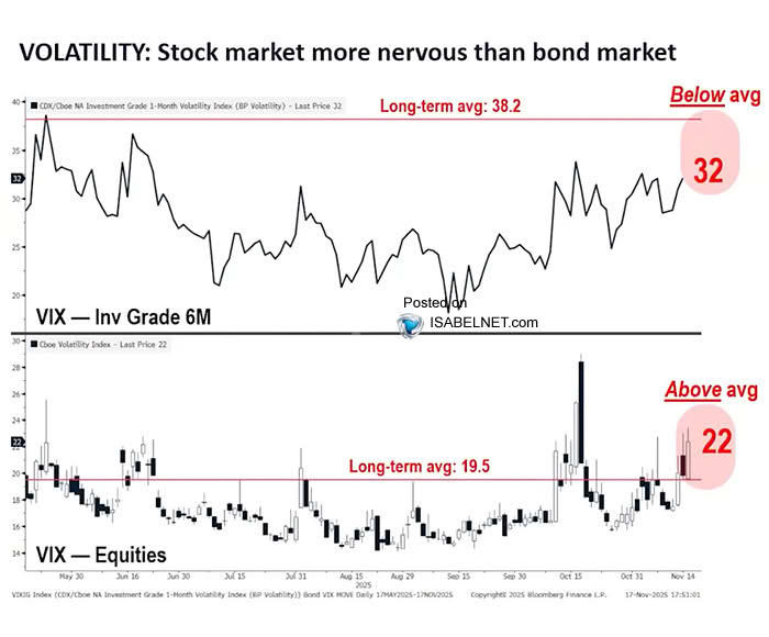 Teknik görünüme bakıldığında, yatırım yapılabilir seviye tahviller için hesaplanan 6 aylık volatilite göstergesi yaklaşık 32 seviyesinde bulunuyor ve bu değer uzun dönem ortalaması olan 38,2’nin altında. Buna karşılık hisse senedi piyasaları için kullanılan klasik VIX endeksi 22 seviyesinde ve uzun vadeli ortalaması olan 19,5’in üzerinde hareket ediyor. Bu tablo, tahvil yatırımcılarının görece rahat, hisse yatırımcılarının ise belirgin şekilde tetikte olduğunu ortaya koyuyor.