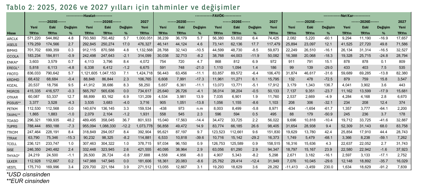 Reel kurun güçlenmesine dayalı politikaların ülke risk primini düşürerek finansal sektörü desteklemesi beklenirken, borçlanma maliyetlerindeki gerilemenin gecikmeli olarak finans dışı sektörlere de olumlu yansıması öngörülüyor. Araştırma kapsamındaki şirketlerde 2025 yılında kademeli toparlanma ve yıllık enflasyona göre düzeltilmiş net kâr büyümesinin %7 seviyesinde gerçekleşmesi bekleniyor.