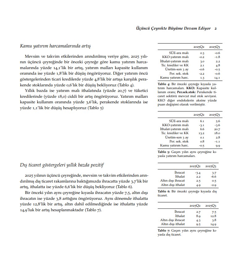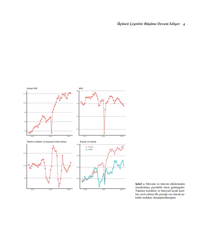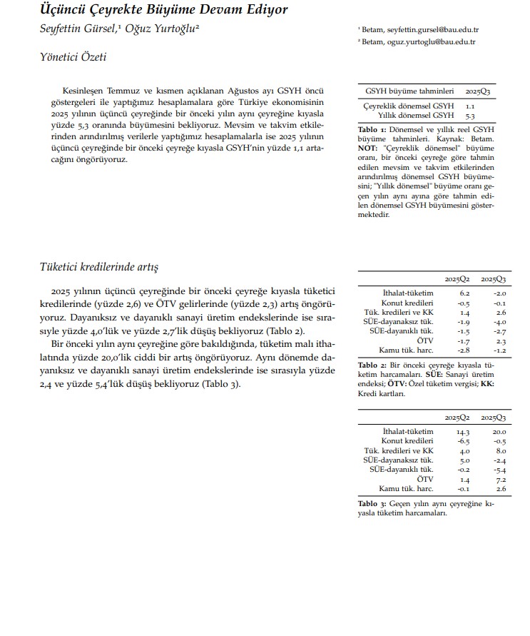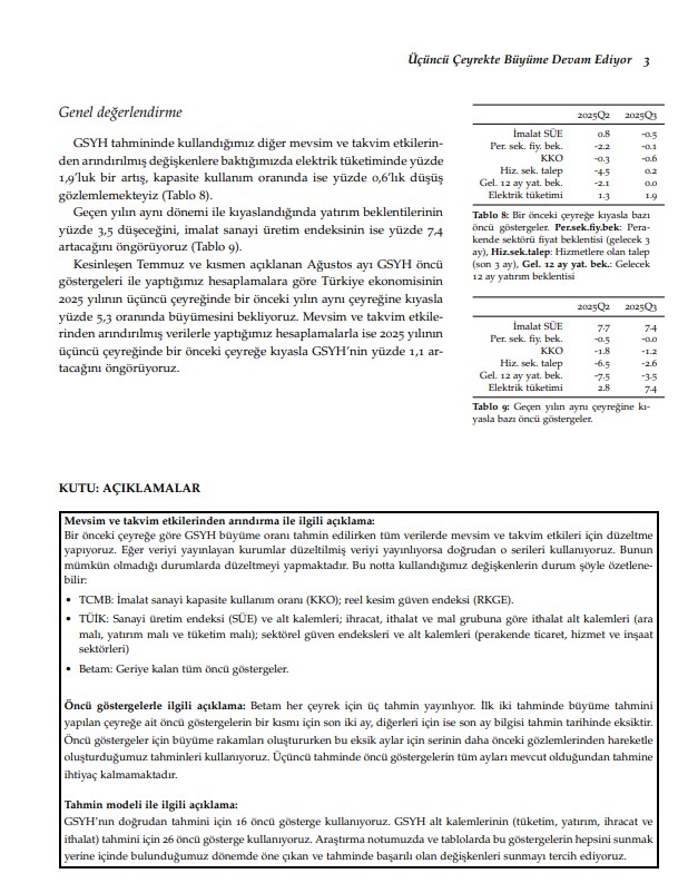 Öncü göstergeler, Türkiye ekonomisinin 2025’in üçüncü çeyreğinde güçlü bir yıllık büyüme ve ılımlı çeyreklik artış kaydedeceğine işaret ediyor.BETAM, Türkiye Ekonomisi'ne ilişkin büyüme tahminlerini açıkladı.