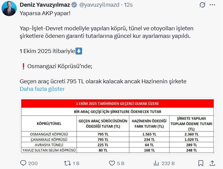 CHP Genel Başkan Yardımcısı Deniz Yavuzyılmaz, sosyal medya hesabından yaptığı paylaşımla, Yap-İşlet-Devret (YİD) modeliyle inşa edilen köprü, tünel ve otoyollar…