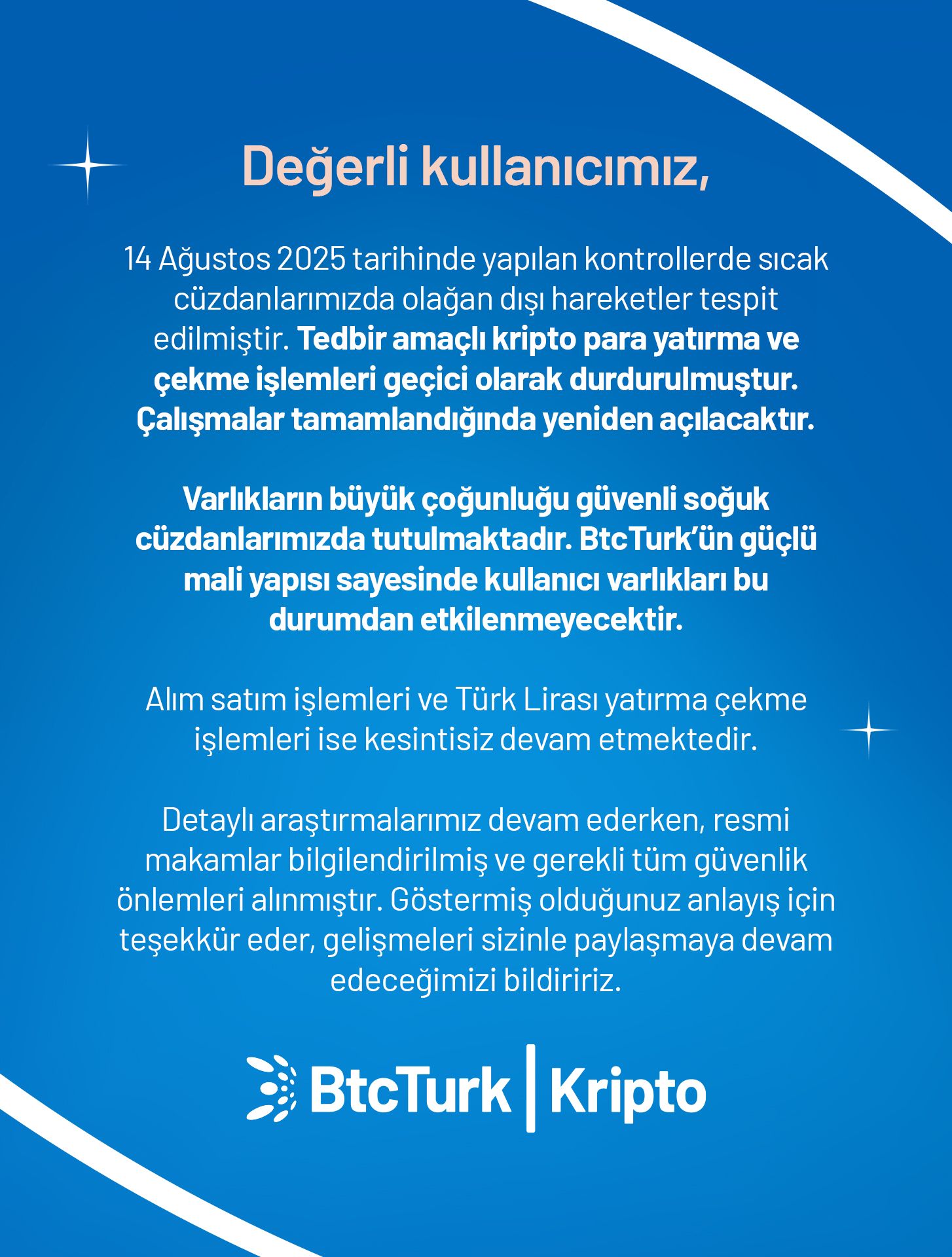 Borsa ayrıca, bu süreçte kripto para alım-satım işlemlerinin ve Türk Lirası yatırma/çekme işlemlerinin kesintisiz bir şekilde sürdüğünü belirtti. Kullanıcılara güvenlik ve şeffaflık vurgusu yapılan açıklamada, gelişmelerin yakından takip edildiği belirtildi.