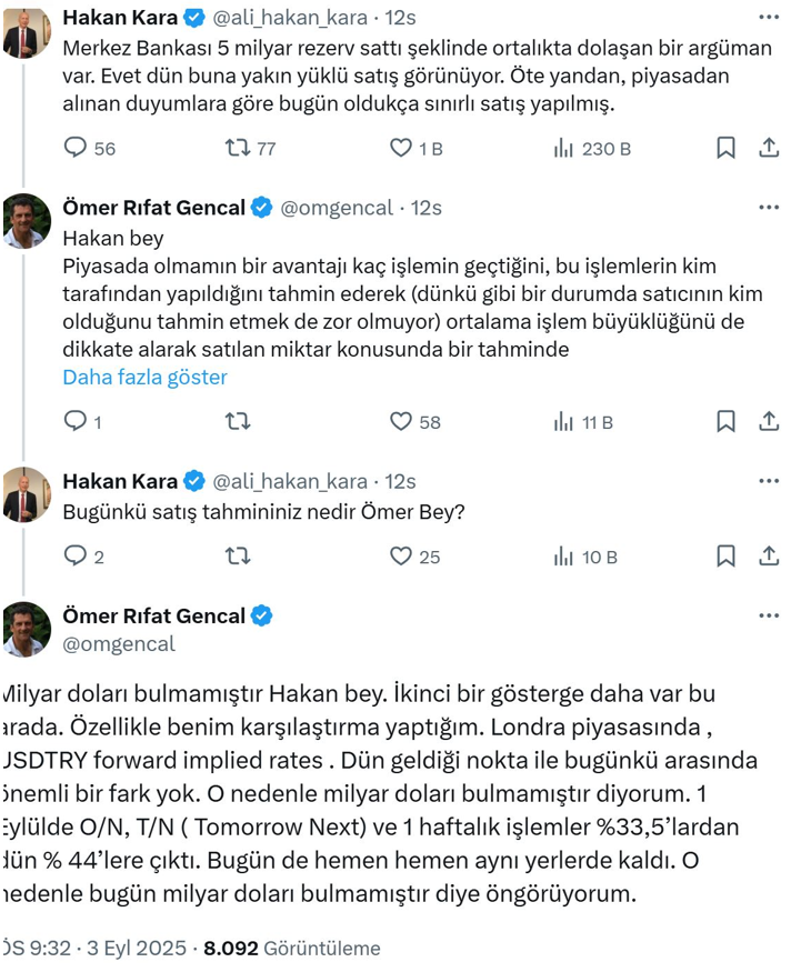 “Milyar doları bulmamıştır Hakan bey. İkinci bir gösterge daha var bu arada. Özellikle benim karşılaştırma yaptığım. Londra piyasasında , USDTRY forward implied rates . Dün geldiği nokta ile bugünkü arasında önemli bir fark yok. O nedenle milyar doları bulmamıştır diyorum. 1 Eylülde O/N, T/N ( Tomorrow Next) ve 1 haftalık işlemler %33,5’lardan dün % 44’lere çıktı. Bugün de hemen hemen aynı yerlerde kaldı. O nedenle bugün milyar doları bulmamıştır diye öngörüyorum.”