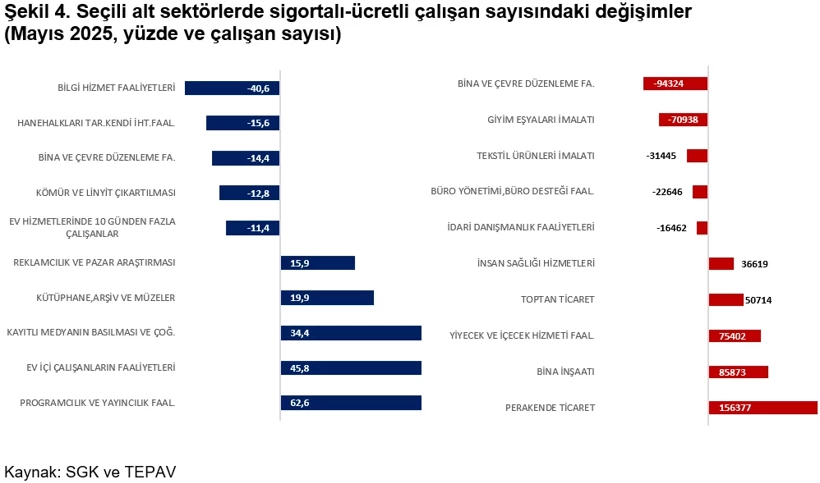 Türkiye Ekonomi Politikaları Araştırma Vakfı (TEPAV), İstihdam İzleme Bülteni’nin 153. sayısını yayımladı. SGK verilerine dayanan rapora göre, sigortalı çalışan sayısı yıllık bazda %0,9 artışla 25 milyon 588 bin 839’a yükseldi. Ancak artışa rağmen, 88 alt sektörün 41’inde istihdam kaybı yaşandı.