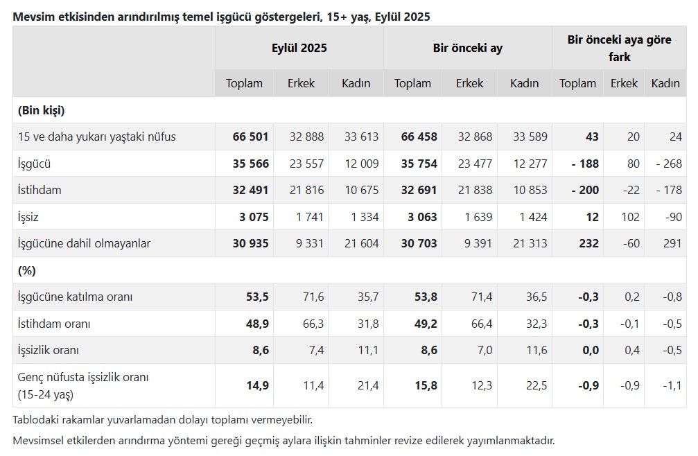 Eylül ayı işsizlik oranı bir ay öncesine göre %8,6 olarak aynı kaldı. Geniş İşsizlik tanımlarından atıl iş gücü oranı ise 1,2 puan azalarak %28,6 oldu. Genç nüfustaki işsizlik oranı 0,9 puan azalarak 14,9 oldu.