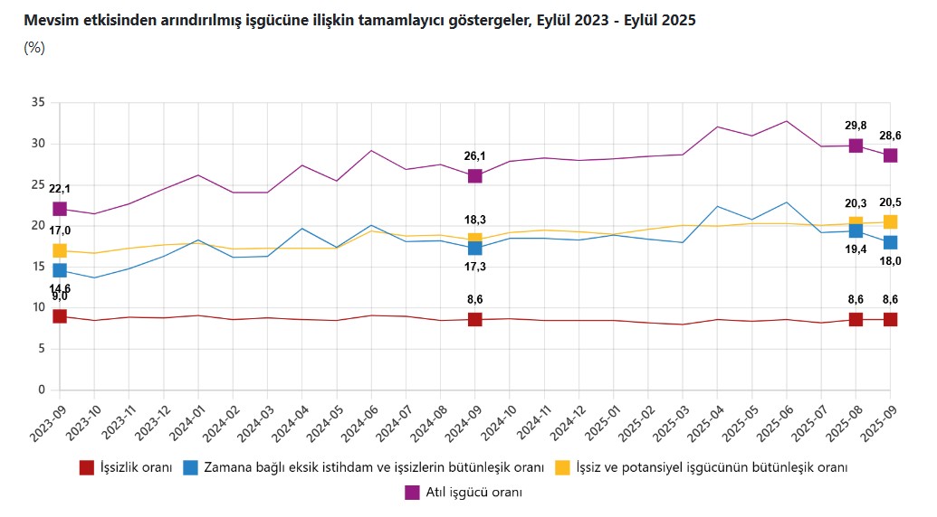 Zamana bağlı eksik istihdam, potansiyel işgücü ve işsizlerden oluşan atıl işgücü oranı 2025 yılı Eylül ayında bir önceki aya göre 1,2 puan azalarak %28,6 oldu. Zamana bağlı eksik istihdam ve işsizlerin bütünleşik oranı %18,0 iken işsiz ve potansiyel işgücünün bütünleşik oranı %20,5 olarak tahmin edildi.