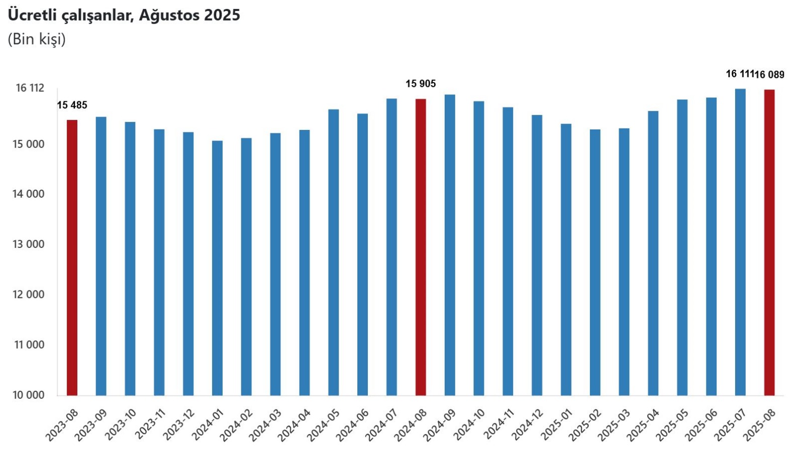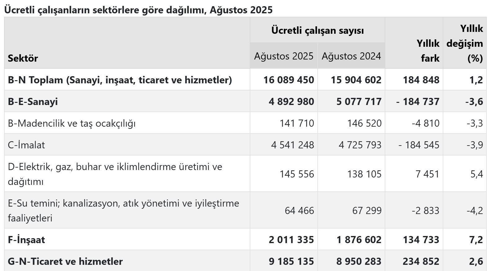 Sanayi, inşaat ve ticaret-hizmet sektörleri toplamında ücretli çalışan sayısı 2025 Ağustos ayında bir önceki yılın aynı ayına göre %1,2 arttı. Ücretli çalışan sayısı bir önceki yılın aynı ayında 15 milyon 904 bin 602 kişi iken, 2025 yılı Ağustos ayında 16 milyon 89 bin 450 kişi oldu.
