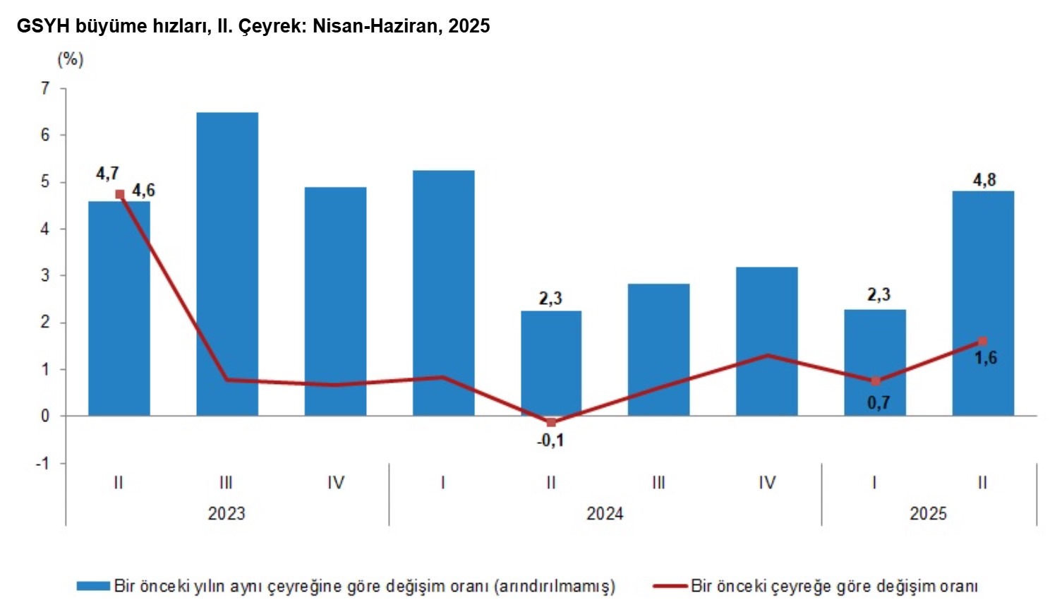 GSYH 2025 yılı ikinci çeyrek ilk tahmini; zincirlenmiş hacim endeksi olarak, bir önceki yılın aynı çeyreğine göre %4,8 arttı.