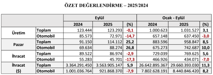 2025’in ilk 9 aylık döneminde toplam pazar, bir önceki yılın aynı dönemine göre yüzde 9 artarak 958 bin 847 adet düzeyinde gerçekleşti. Bu dönemde, otomobil pazarı da yüzde 10 oranında artış sağladı ve 742 bin 687 adet oldu. Ticari araç pazarına bakıldığında ise yılın ilk dokuz ayında, bir önceki yılın aynı dönemine kıyasla toplam ticari araç pazarı yüzde 4, hafif ticari araç pazarı ise yüzde 6 büyürken, ağır ticari araç pazarında yüzde 7 gerileme yaşandı. 2025 yılı Ocak-Eylül döneminde otomobil satışlarındaki yerli araç payı yüzde 29, hafif ticari araç pazarında yerli araç payı ise yüzde 21 olarak gerçekleşti.