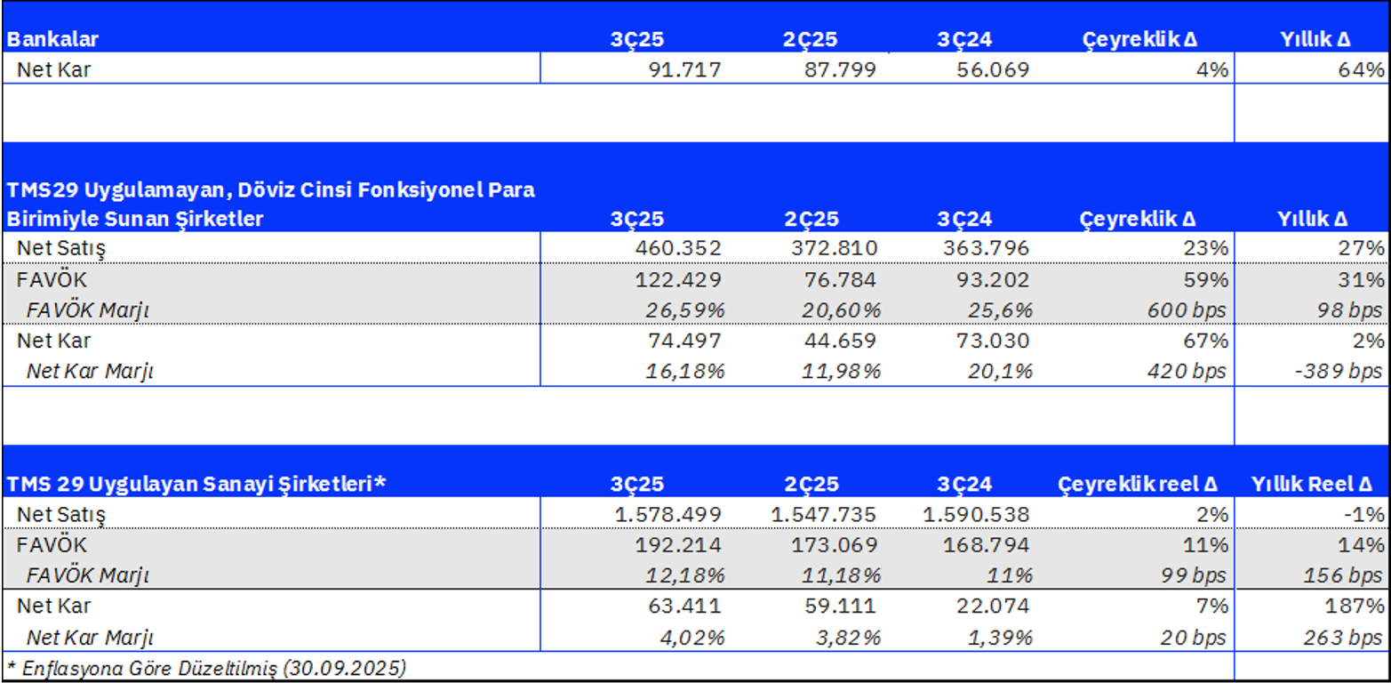 Gedik Yatırım Araştırma Direktörü Ali Akkoyunlu, “Halka açık şirketler 2024 yıl sonunda reel anlamda %50 net kar ve %14 FAVÖK daralması yaşadı. Takibimizdeki şirketlerde ise 2025 yılının ilk 3 ayında Y/Y’a %76, net kar FAVÖK’te ise %16 daralması gerçekleşmişti. İlk 6 ayın sonunda ise net kar daralması %48’e, FAVÖK daralması da %2’ye gerilemiş durumda. Daralmanın ana nedenleri olarak azalan alım gücü, talebe bağlı ürün fiyat artışlarının sınırlanması ve göreceli güçlü kalan TL ve zayıf global ekonomik aktivite nedeni ile sınırlanan ihracat gelirleri sayılabilir. Ancak daralmadaki azalış dikkat çekici gözüküyor. 3Ç 2025’de ise, takibimizdeki şirketler için (yıllık bazda/çeyreksel) %31’lik bir FAVÖK artışı ve %33’lük bir net kar artışı bekliyoruz. Avrupa ve Türkiye’deki ekonomik büyüme ortamı genel olarak geçmiş yıllara nazaran daha cansız bir trendde devam etmesine rağmen, yıllık bazdaki artışın nedeni geçen yılın ikinci yarısındaki düşen karlılıkların baz etkisinin devreye girmiş olmasıdır. 2025’in tümü için ise için reel olarak %1 net kar, %5 FAVÖK artışı beklemekteyiz. Bu da karlılıklar açısından 2025 yılının ikinci yarısının birinci yarıya nazaran daha yüksek seyredeceğine işaret ediyor. Bu bağlamda bankacılık sektöründeki net kar büyüme tahminimiz %12 iken, sanayi şirketleri için yüzde %7 daralma beklemekteyiz.” değerlendirmesini yaptı.