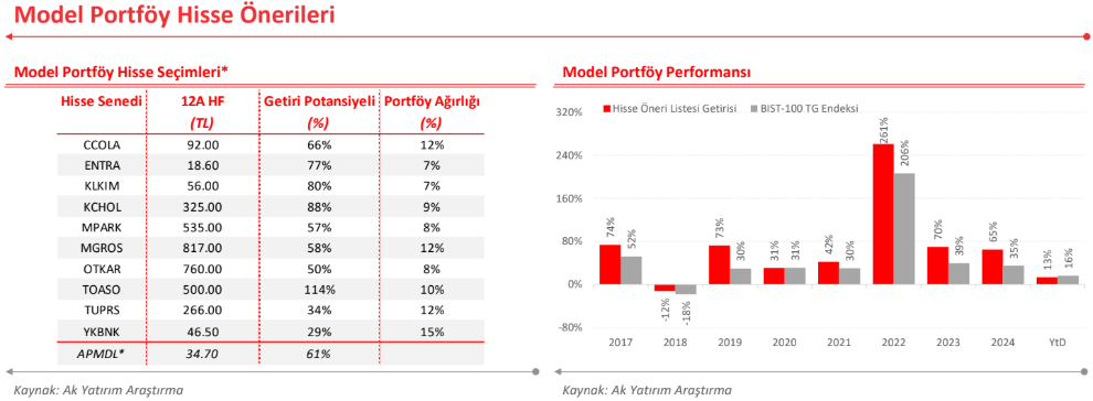 * Ak Yatırım Araştırma Birimi’nin yayınladığı Model Portföy’de yer alan hisse senetlerine yatırım yapan ve Ak Portföy Yönetimi A.Ş. tarafından yönetilen Ak Portföy BİST 100 Endeksi Model Portföy Hisse Senedi Yoğun Borsa Yatırım Fonu (APMDL) için gösterge niteliğinde 12 aylık hedef fiyat ve getiri potansiyeli hesaplanmaktadır. Hesaplama, Model Portföy’de yer alan hisse senetlerinin 12 aylık hedef fiyat, getiri beklentisi ve portföy ağırlıkları dikkate alınarak ve APMDL’nin yıllık %2’lik fon yönetim ücreti düşülerek yapılmaktadır. Model Portföy’de yer alan hisse senetlerinin ve/veya bu hisse senetlerinin Model Portföy’deki ağırlıklarının değişmesi durumunda APMDL’nin hedef fiyatı da değişebilecektir.