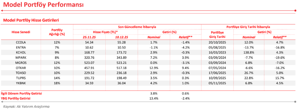 Son güncellemenin ardından hisse öneri listemizin getirisi gösterge endekse paralel hareket etti. Hatırlanacağı üzere, 25 Kasım’daki güncellememizde Torunlar GYO’yu model portföyden çıkarmış, yerine hisse koymadan, bu hissenin ağırlığını diğer hisselere dağıtmıştık. O zamandan beri hisse öneri listemiz %3,8 değer kazancı ile BIST-100 toplam getiri endeksine paralel hareket etti. Dolayısıyla, hisse öneri listemizin yılbaşından bu yana getirisi %13,4 ve böylece bu dönemde BIST-100 toplam getiri endeksine göre relatif getirisi de -%2,4 oldu.