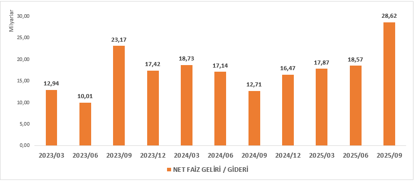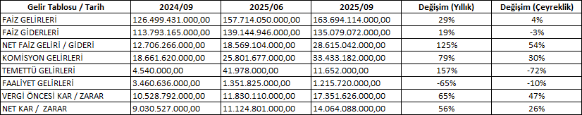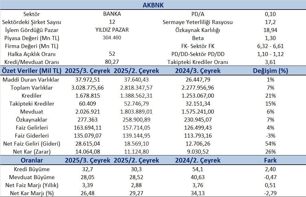 Akbank’ın bilanço hareketleri incelendiğinde toplam varlıkların bir önceki yılın üçüncü çeyreğine göre yaklaşık olarak %33 büyüdüğüne ve aktiflerin içinde yer alan Kredilerin ise %34 büyüdüğüne işaret etmektedir. Takipteki krediler aktif kalitesi için önemli bir gösterge olup toplam aktifin içindeki payı son çeyrekte %2’ye düştüğü aynı dönemin bir yıl öncesine göre artış yaklaşık %88 olmuştur. Ancak bankanın karşılık ayırmada ihtiyatlı yaklaşımı; %32,7 seviyesindeki güçlü karşılık oranı ile dengelenmeye çalışılmıştır. Pasif tarafta ise Mevduat artışı bir önceki yılın aynı dönemine göre %29 artış göstermiştir. Düşük maliyetli mevduat tabanı optimizasyonu politikası ile 3. çeyrekte TL vadeli mevduatlarda 190 baz puanlı pazar payı kullanımı düşük TL Kredi/mevduat rasyosu ile net faiz marjının iyileştirilmesi için alan açılmıştır. Kredi/Mevduat oranı yani Plase oranı bankacılık için önemli bir rasyo olup bu oranın yüksekliği bankacılık çalışma prensiplerine göre istenen bir orandır. Kredi/Mevduat oranı Akbank için son çeyrekte %80,3’lerde gerçekleşmiştir. Özkaynaklar ise aynı dönemin bir yıl öncesine göre %20 artmıştır. Faiz gelirleri %29 artarken faiz giderleri ise sadece %19 artmış ve net faiz gelirlerinde ise bu durum yaklaşık %125’lik gibi güçlü bir artışa işaret etmiştir. Gelir tablosunda dikkat çeken gelişme de faaliyet giderlerinin bir önceki ve yıllık bazda gayet düşükte oluşmasıdır.