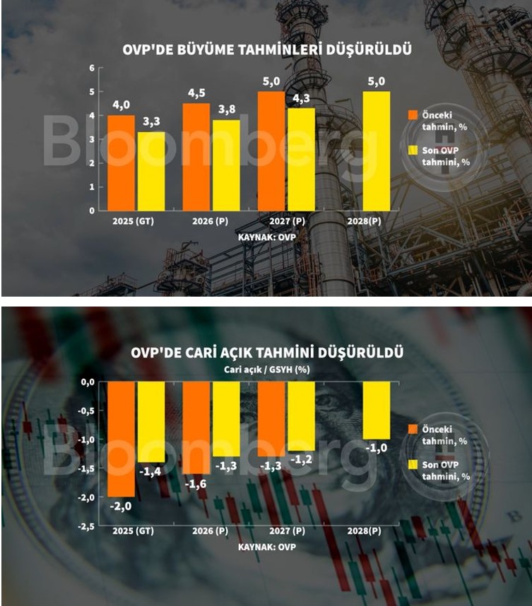 Dün açıklanan Orta Vadeli Program kuşkularımı daha da artırdı. OVP 2026 ve 2027 için daha önceki hedeflere göre daha düşük büyüme ve daha düşük cari açık öngörüyor. OVP hedefleri BloombergHT’nin hazırladığı grafiklerde şöyle yer aldı: