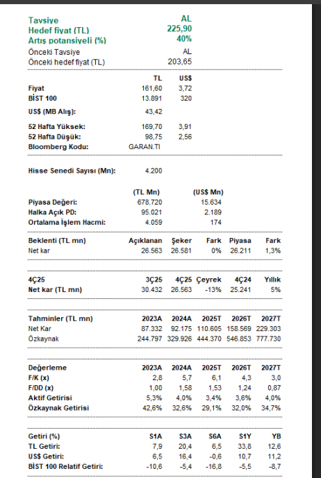 Açıklanan 4Ç25 finansal sonuçları, net kârın beklentilerle birebir uyumlu gerçekleşmesi nedeniyle “Nötr” olarak değerlendiriliyor. 2026 beklentileri doğrultusunda yapılan revizyonlarla birlikte, Garanti BBVA için 203,65 TL olan hedef fiyat 225,9 TL’ye yükseltilirken, “AL” tavsiyesi korunuyor.