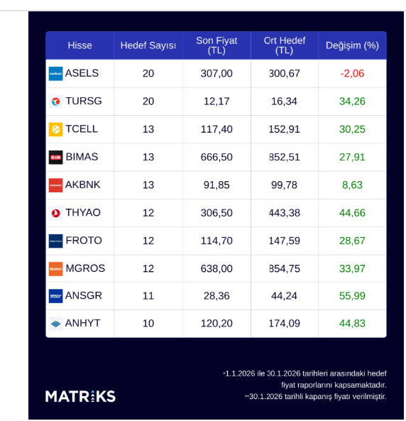 Matriks Haber’in 1 Ocak - 30 Ocak 2026 tarihleri arasında paylaştığı hedef fiyat raporlarından derlediği bilgiye göre, bu dönemde en çok sayıda tavsiye raporu paylaşılan hisse senedi 20’şer kurumun raporu ile Aselsan ve Türkiye Sigorta oldu.