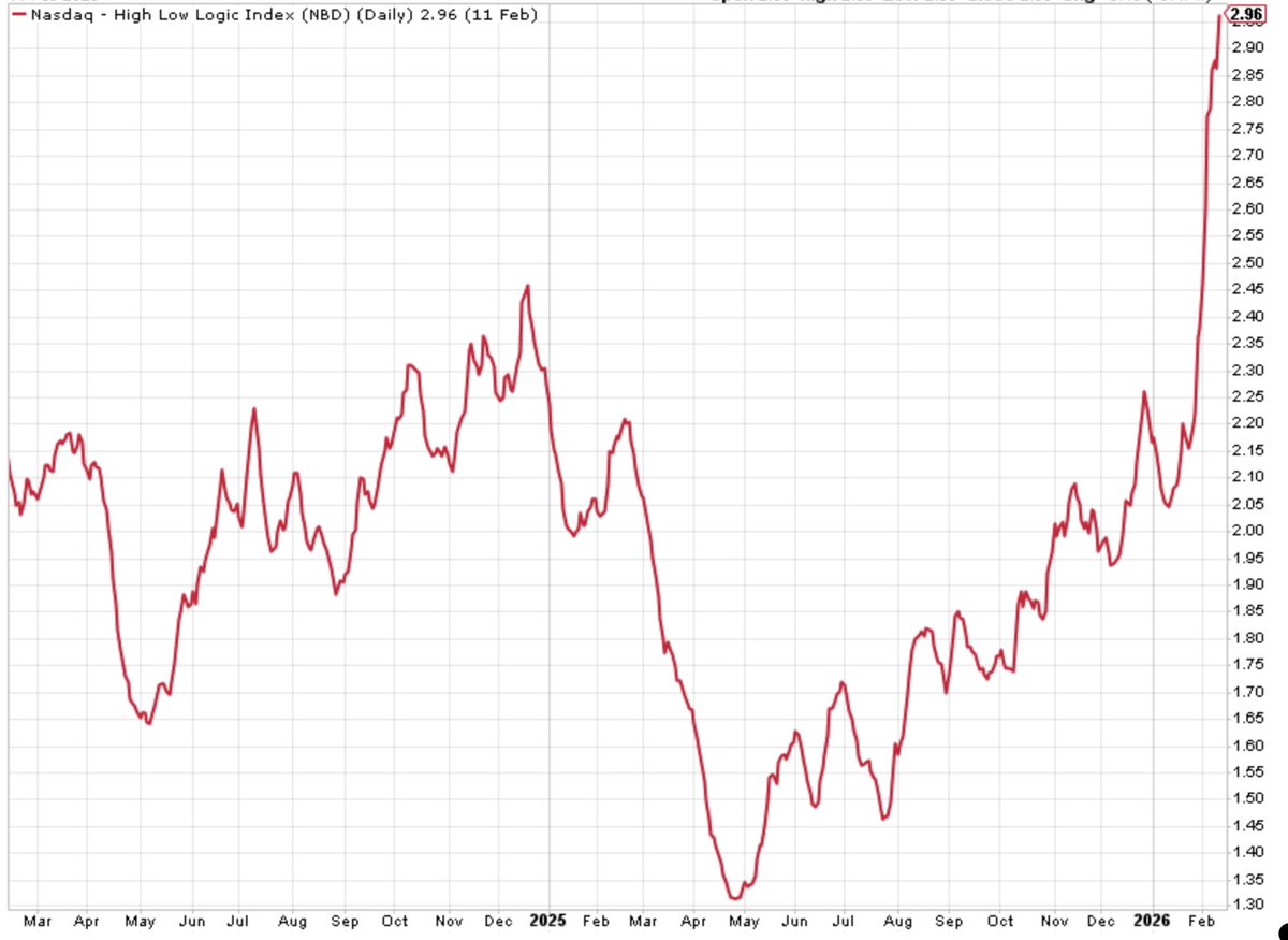 Birinci grafik, Nasdaq tarafında “yüksek-düşük” mantığıyla hesaplanan bir piyasa içi göstergenin seyrini gösteriyor. Grafik boyunca iniş çıkışlar olsa da özellikle 2025’in ortasından itibaren kademeli bir toparlanma ve 2026’ya yaklaşırken hızlanan bir yükseliş göze çarpıyor. En kritik nokta ise grafiğin son bölümündeki neredeyse dikey sıçrama: Gösterge kısa süre içinde 2,96 seviyesine kadar tırmanmış görünüyor.