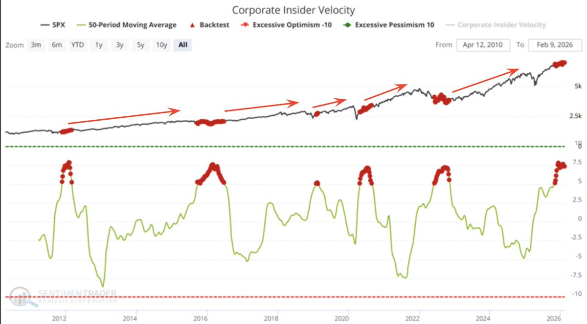 Son grafik ise “Corporate Insider Velocity” başlığıyla, piyasa (SPX) ile birlikte bir duyarlılık/pozisyonlanma ölçümünün zaman içindeki dalgalanmasını gösteriyor. Üstte gri çizgi endeksin genel yönünü verirken, alttaki yeşil çizgi ilgili göstergenin seviyesini gösteriyor. Grafikte kırmızı noktalarla işaretlenen bölgeler, göstergenin “aşırı iyimserlik” bölgesine geldiği dönemleri vurguluyor gibi duruyor. Bu noktaların ardından gelen dönemlerde zaman zaman düzeltmelerin veya daha yavaş ilerleyen süreçlerin yaşandığı da görsel olarak ima ediliyor.