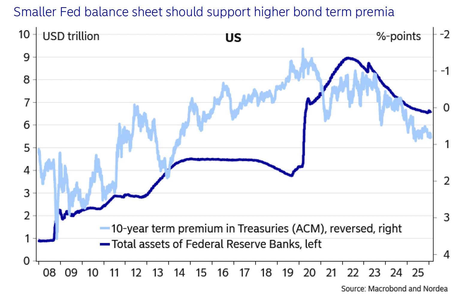 Grafik, Fed bilançosu küçüldükçe vade priminin yeniden yükseldiğini ortaya koyuyor. Bu durum, uzun vadeli faizlerin yalnızca kısa vadeli faiz beklentilerinden değil, doğrudan doğruya piyasanın risk algısından etkilendiğini gösteriyor.