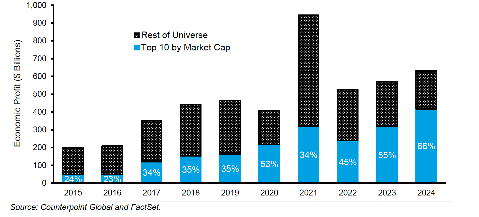 Son yıllarda ortaya çıkan tabloya göre, borsadaki en büyük 10 şirket, toplam piyasa değerinin yaklaşık üçte birini oluştururken, ekonomik kârın yaklaşık üçte ikisini üretiyor. Bu ne demek? En basit hâliyle şu: Şirketlerin “pahalı” görünmesi tek başına hikâyeyi anlatmıyor. Asıl önemli nokta, bu devlerin gerçekten çok yüksek bir kârlılık ve verimlilikle çalışıyor olması. Ekonomik kârın payı, piyasa değeri payından sürekli daha yüksek seyrediyor. Bu da dev şirketlerin, sadece “şişmiş” değil, çoğu durumda “kâr makinesi” gibi çalıştığını düşündürüyor.