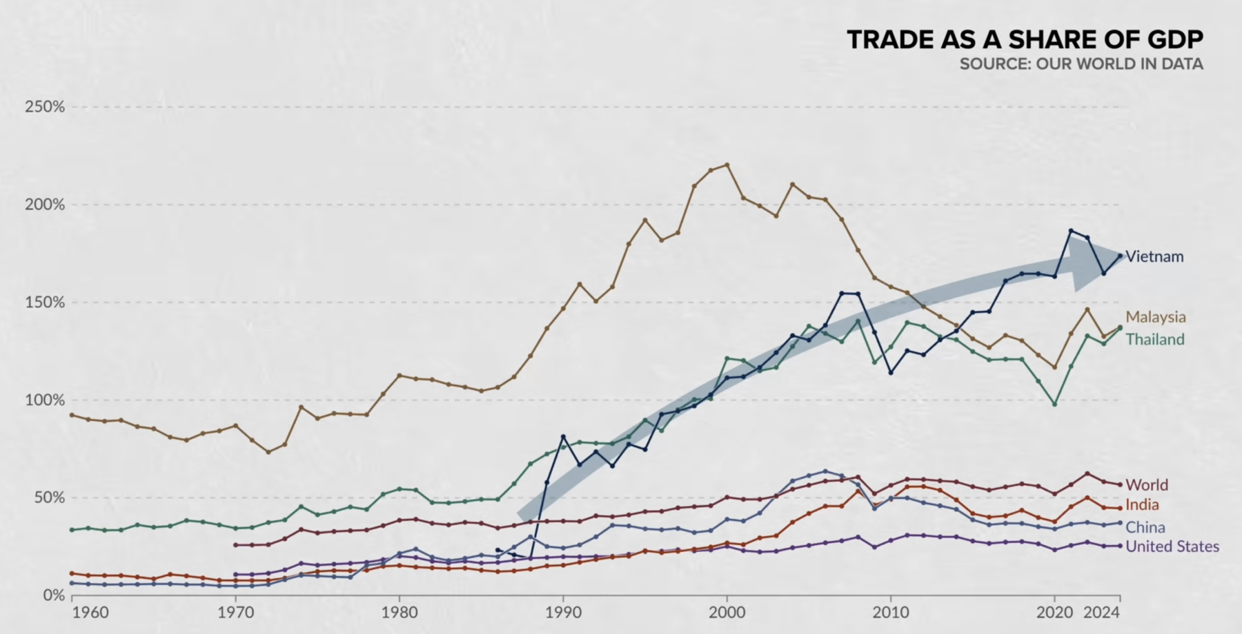 Vietnam’ın ekonomik atılımının belki de en belirleyici unsuru, dışa açık bir ekonomi modelini benimsemesi oldu. Ülke, bölgesel ve küresel ticaret anlaşmalarına katılarak pazarlarını genişletti. Gümrük tarifeleri düşürüldü, yatırım ortamı iyileştirildi ve yabancı şirketler için cazip bir üretim merkezi haline gelindi.