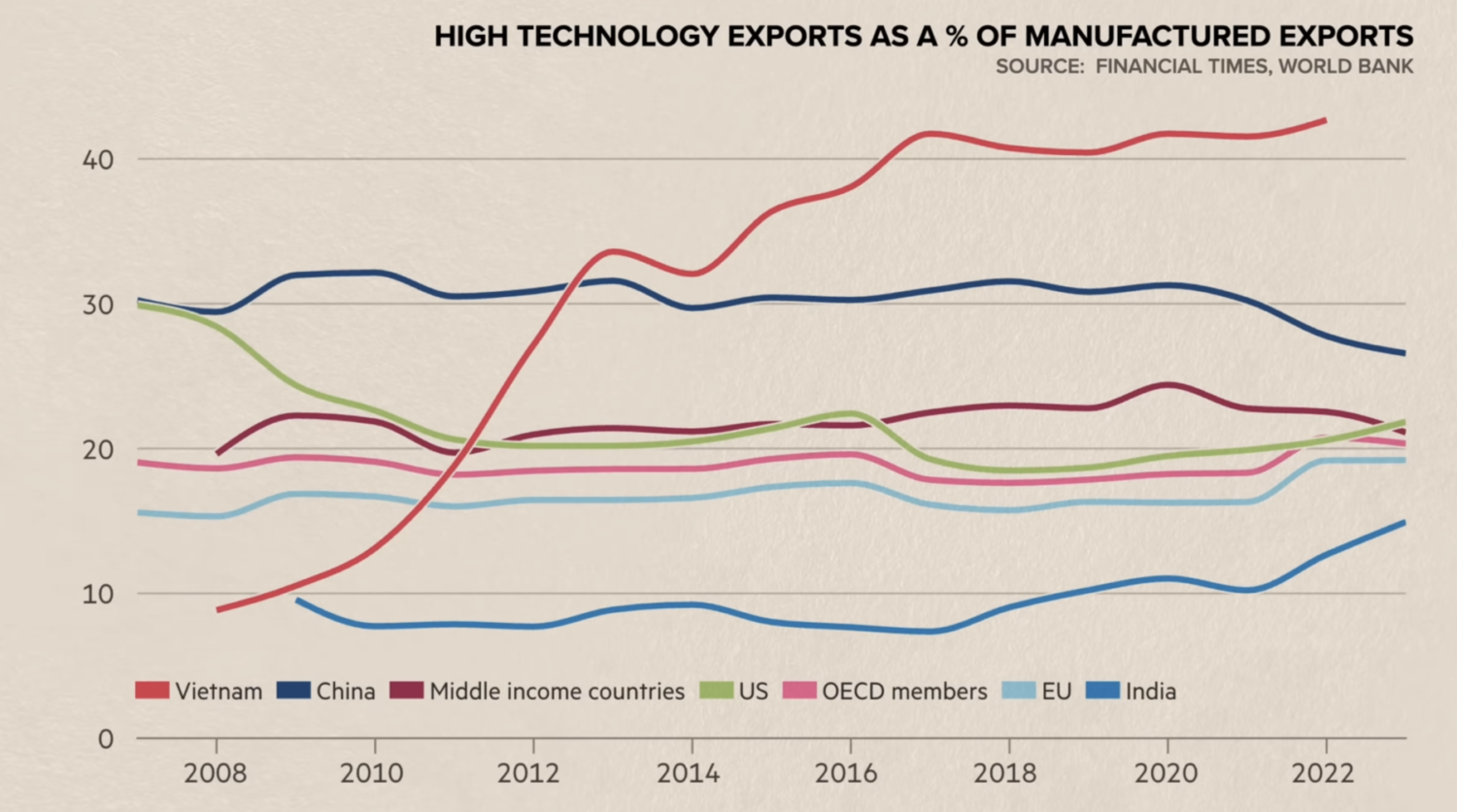 Eğitim seviyesi yüksek bir toplum, üretim zincirinde yukarı çıkmayı mümkün kılar. Vietnam da bunu başardı. Başlangıçta düşük katma değerli üretime odaklanan ülke, zamanla daha teknolojik ve karmaşık ürünlerin üretimine yöneldi. Yüksek teknoloji ürünlerinin ihracattaki payı her geçen yıl artıyor.