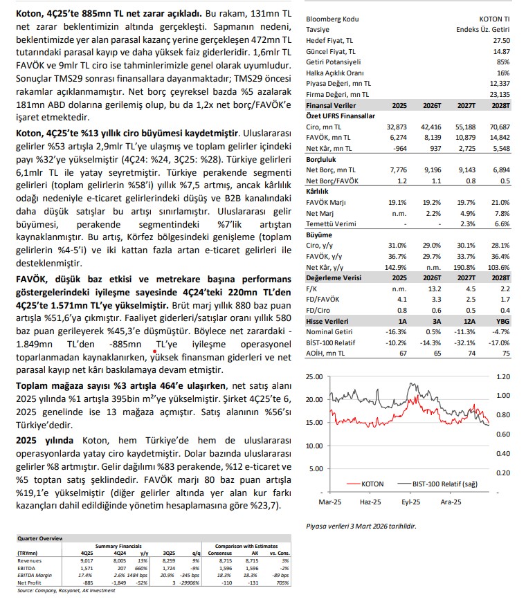 AK Yatırım’dan KOTON Şirketi 4Ç25 Kâr Değerlendirmesi