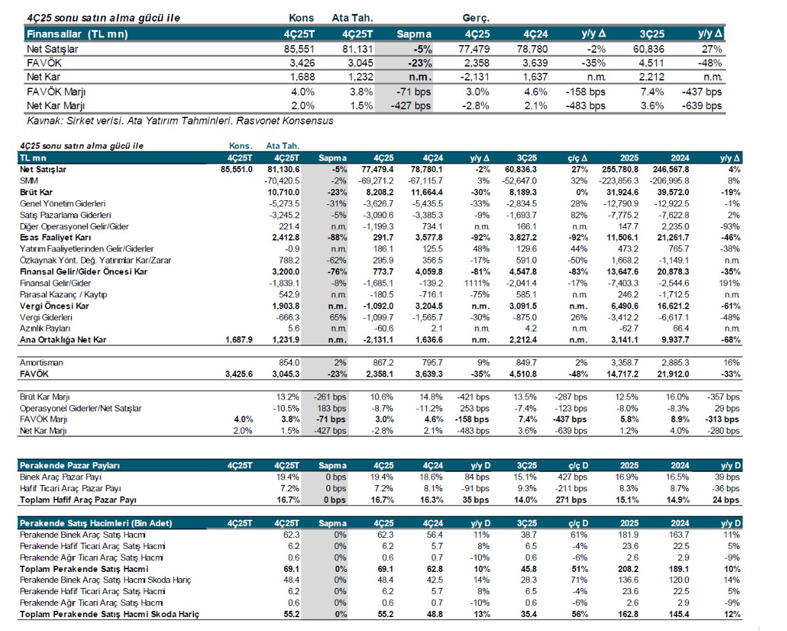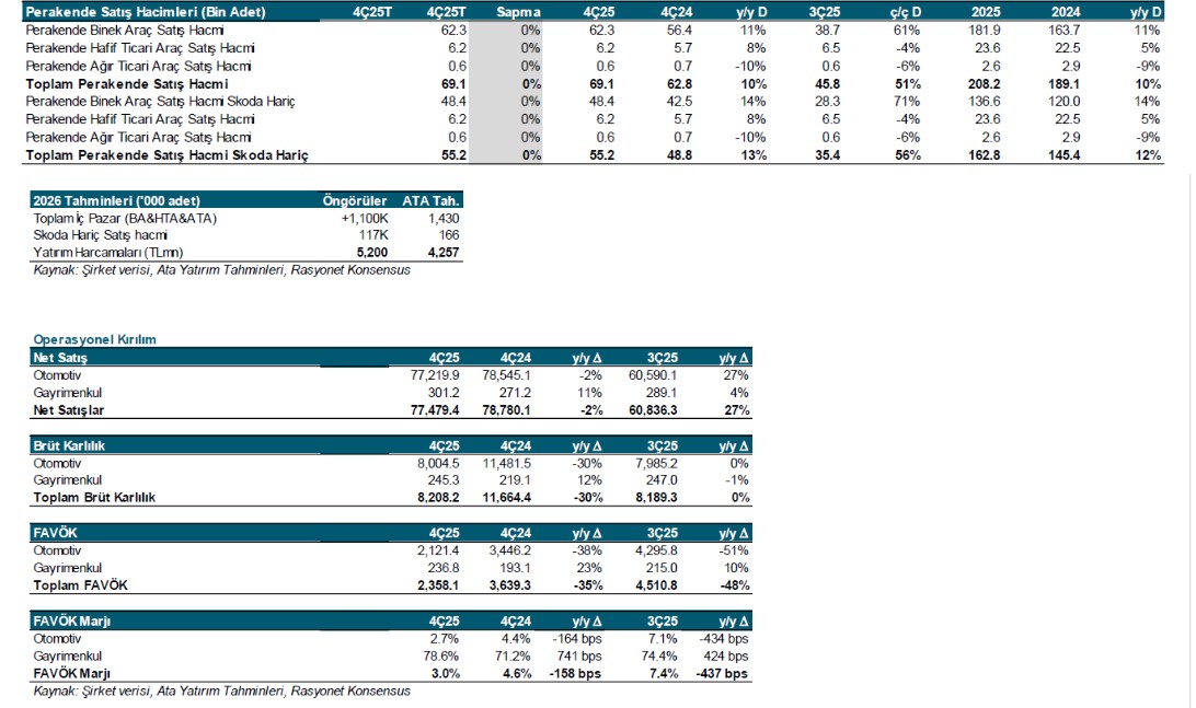 4Ç25’te Skoda dahil toplam toptan satış hacmi yıllık bazda %10 artarak 69.1 bin adet olarak gerçekleşti. 4Ç25’te Skoda hariç toptan satış hacmi yıllık bazda %13 artarak 55.2 bin adede yükseldi. Şirketin otomotiv segmenti gelirleri 4Ç25’te yıllık %2 artarak 77.2 milyar TL’ye yükselirken, gayrimenkul segmenti gelirleri yıllık %11 artışla 301.2 mn TL’ye ulaştı.