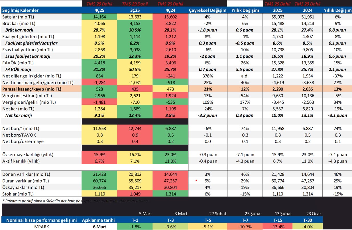 MLP Sağlık Hizmetleri, 4Ç25’te 14.164 milyon TL gelir (Konsensüs: 14.048 milyon TL / Deniz Yatırım: 14.255 milyon TL), 4.418 milyon TL FAVÖK (Konsensüs: 4.301 milyon TL / Deniz Yatırım: 4.420 milyon TL) ve 1.284 milyon TL net kar (Konsensüs: 1.447 milyon TL / Deniz Yatırım: 1.550 milyon TL) açıkladı. 4Ç25 finansallarında parasal kazanç/kayıp kalemi altında 528 milyon TL’lik olumlu etki oluştu.