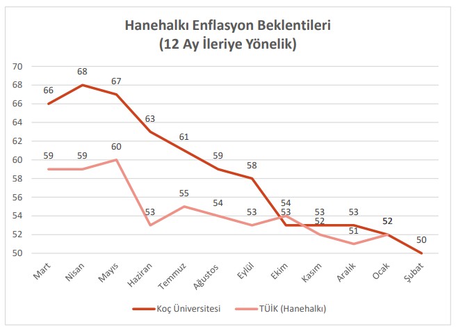 Koç Üniversitesi’nin Veri Enstitüsü ile birlikte hazırladığı Koç Üniversitesi Hanehalkı Enflasyon Beklenti Anketi’nin şubat ayı sonuçları da yayımlandı.