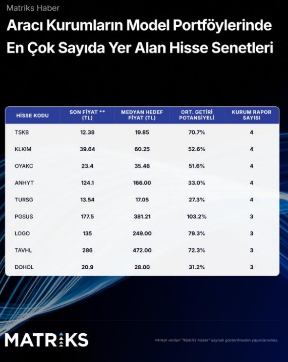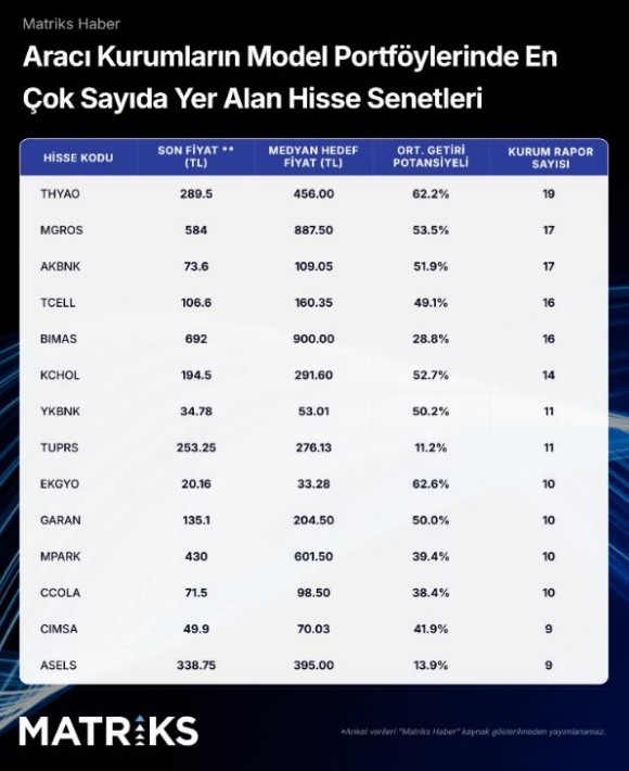 2025 yılı 4.çeyrek bilanço döneminin ardından aracı kurumların model portföylerinde en fazla yer alan hisse senedi listesinde Türk Hava Yolları (THYAO) birinci sıradaki yerini korudu. Ortalama getiri potansiyeli açısından Pegasus (PGSUS), Ülker (ULKER), Logo Yazılım (LOGO) ve Sabancı Holding (SAHOL) gibi hisseler öne çıktı. Tüm hisseler bazında ortalama potansiyel getiri %48,8 olarak hesaplandı.
