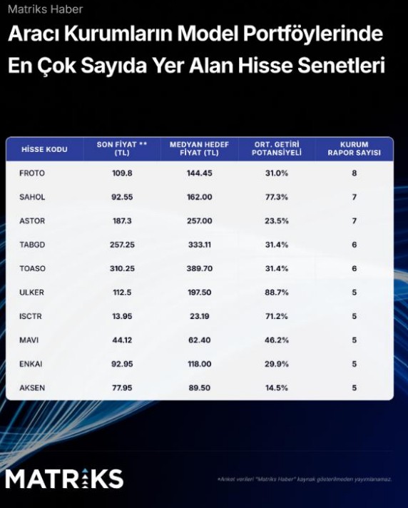 Matriks Haber’in toplam 33 aracı kurumun model portföyünden derlediği araştırmada 70 farklı hisse senedi ile 24 sektör yer aldı. Çalışmada hisseler; model portföylerde yer aldıkları kurum sayısına göre sıralanırken, ortalama getiri potansiyelleri, getiri dağılımı ve sektör bazlı pozisyon yoğunlukları birlikte değerlendirildi. En yüksek getiri potansiyeli sunan hisseler ayrı bir başlık altında değerlendirilirken sektörel dağılım ve hisse/pozisyon sayıları üzerinden model portföylerin genel yapısı ortaya kondu.