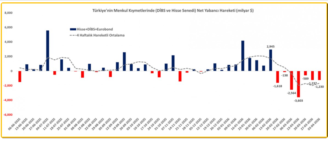 Yurt dışı yerleşiklerin menkul kıymet portföyündeki çıkış, 3 Nisan haftasında 1,2 milyar dolar olarak gerçekleşti. Son yedi haftada toplam çıkış 11 milyar dolara ulaştı.