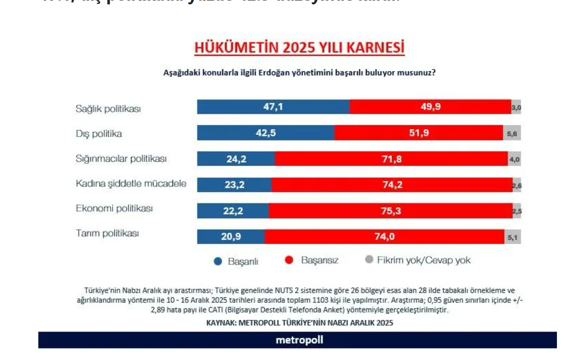 Metropoll Araştırma’nın Türkiye’nin Nabzı – Aralık 2025 çalışması, hükümetin temel politika alanlarındaki performansına yönelik toplumsal algının zayıf olduğunu ortaya koydu. Araştırma, 10–16 Aralık tarihleri arasında 28 ilde 1.103 kişiyle gerçekleştirildi.