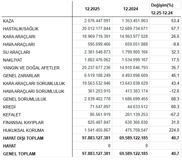 Branşlara göre Anadolu Sigorta’nın 2025 yılı prim üretimleri şu şekilde: