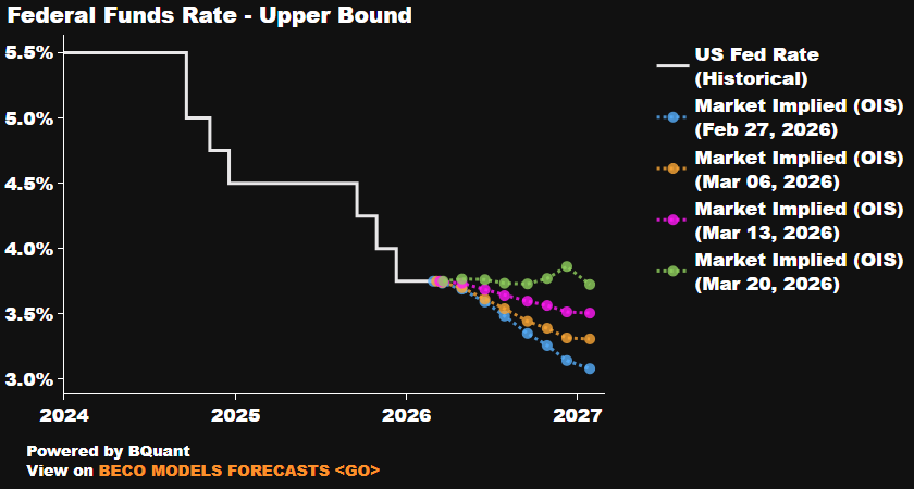 • 20 Mart 2026 (Yeşil Hat – En Güncel): Sadece üç hafta içinde beklentiler tamamen tersine dönmüş durumda. En güncel veri olan yeşil hat, faiz indirimlerinin duracağını, hatta 2026 sonuna doğru faizlerin tekrar bir miktar yükselerek %3,75 – %4,0 bandında kalacağını öngörüyor.