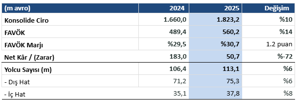 Devam eden yolcu büyümesi, Ankara’da yeni imtiyaz döneminin başlaması ve BTA’nın Antalya’da büyümesi sonucunda ciromuzu yolcu büyümesinin üstüne çıkardık. 2025 ciromuz yüzde 10 büyümeyle 1 milyar 823 milyon avro olarak gerçekleşti. FAVÖK cironun da üzerinde, yüzde 14 oranında büyüdü ve 560 milyon avroya ulaştı. Serbest nakit akışı ise yüzde 44 büyüme ile 223 milyon avro oldu. Kuvvetli nakit akışı sayesinde, yoğun bir yatırım yılında olmamıza rağmen net borcumuz yüzde 6 düşerek 1,6 milyar avroya indi. Net kâr 119 milyon avro tutarında bir kerelik nakit dışı etkilere maruz kaldı ve 51 milyon avro olarak gerçekleşti.