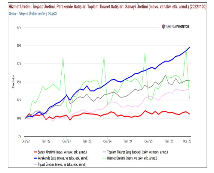 ABD’de 4Ç2025’te GSYH (yıllıklandırılmış) bir önceki çeyreğe göre %0,7 büyümeye yavaşladı, satışlar %0,4 artışa yavaşladı, çekirdek PCE enflasyonu yıllık %2,7 artışa yavaşladı. Aşağıdaki grafikte görülebileceği gibi 4Ç2025’te ekonomik aktivite ve fiyatlarda yavaşlama, Ocakta sanayi üretimi ve perakende satışlarda ılımlı hızlanma ile aylık PCE enflasyonu hızının yatay kalması normalde FED’i faiz indirimine yaklaştırsa da ABD destekli İsrail-İran savaşı FED’in 18 Mart’ta beklemede kalmasına sebep olacak.