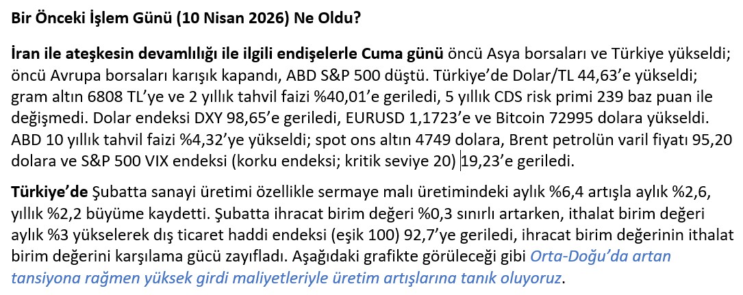 İran ile ateşkesin devamlılığı ile ilgili endişelerle Cuma günü öncü Asya borsaları ve Türkiye yükseldi; öncü Avrupa borsaları karışık kapandı, ABD S&P 500 düştü. Türkiye’de Dolar/TL 44,63’e yükseldi; gram altın 6808 TL’ye ve 2 yıllık tahvil faizi %40,01’e geriledi, 5 yıllık CDS risk primi 239 baz puan ile değişmedi. Dolar endeksi DXY 98,65’e geriledi, EURUSD 1,1723’e ve Bitcoin 72995 dolara yükseldi. ABD 10 yıllık tahvil faizi %4,32’ye yükseldi; spot ons altın 4749 dolara, Brent petrolün varil fiyatı 95,20 dolara ve S&P 500 VIX endeksi (korku endeksi; kritik seviye 20) 19,23’e geriledi.