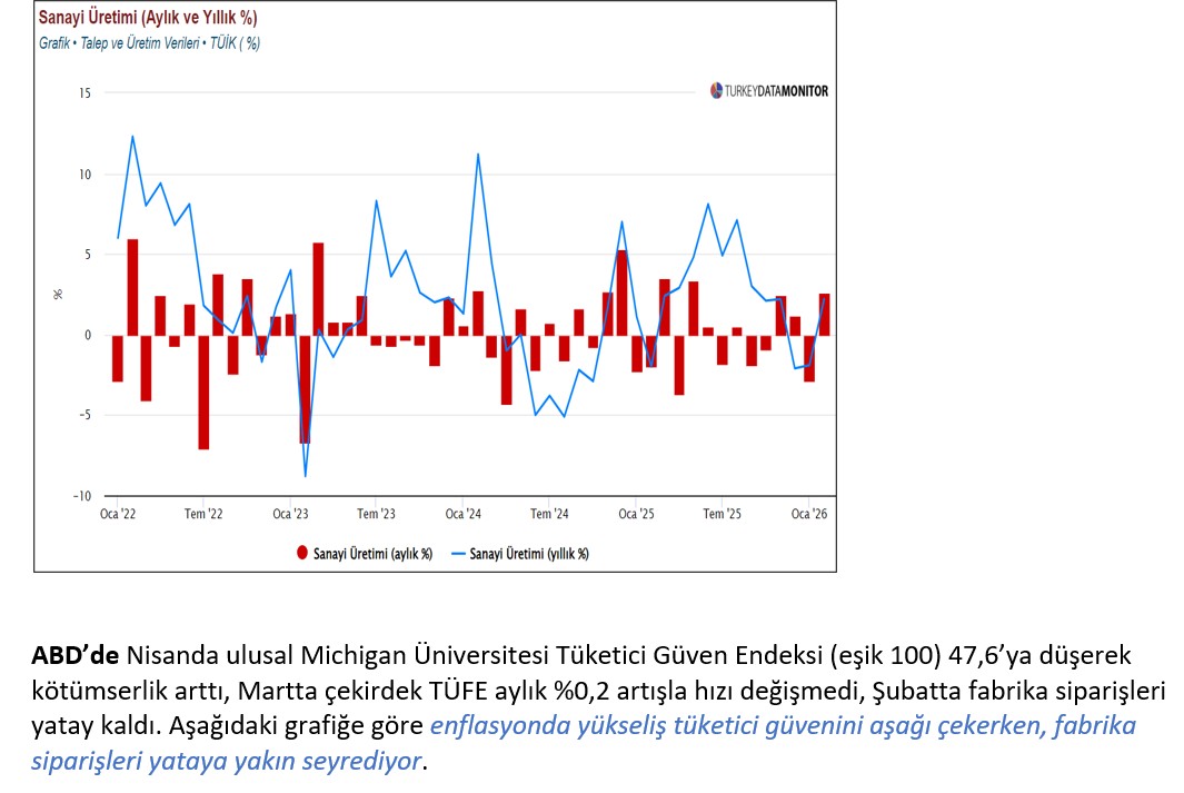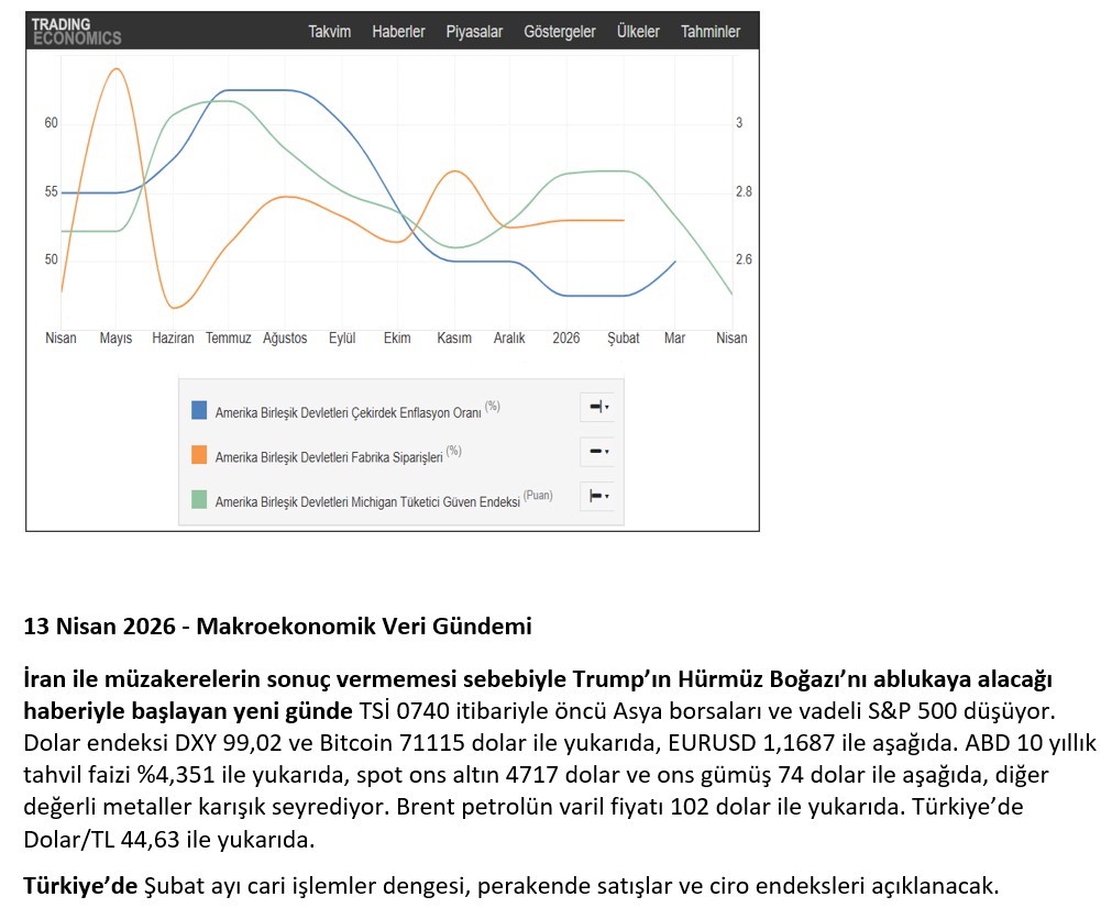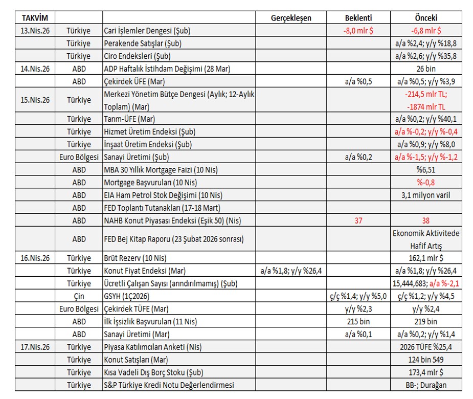 - Jeopolitik Riskler… Rusya-Ukrayna savaşı sürerken, İran-İsrail-ABD hava saldırılarıyla Orta Doğu’nun süresi belirsiz bir girdaba girmesiyle Türkiye’ye olası göç dalgası ve ekonomik aktivitede zayıflık bütçe harcamalarını artırarak borçlanma maliyetlerini yukarı çekecektir; sürecin uzamasıyla TCMB faiz artırabilir. İran ile 15 günlük ateşkesin bozulması ve Trump’ın Hürmüz Boğazını ablukaya alacağını açıkladığı 13 Nisan ile birlikte petrol fiyatları 100 doların üzerine çıkarak uzun soluklu belirsizlik artıyor.