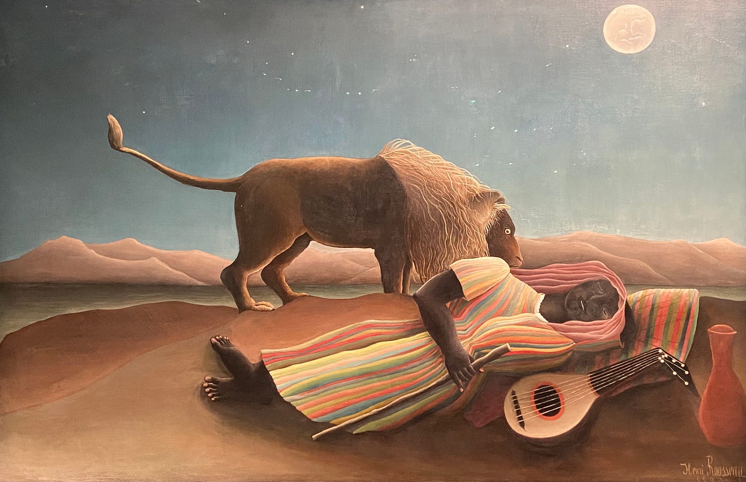 Başyapıt sadece Rousseau’ya özgü dilin zirvelerinden biridir: Çölün ortasında uyuyan bir kadın figürü ve yanı başında duran aslan — ne saldırır, ne de geri çekilir. Zaman durmuş gibidir.