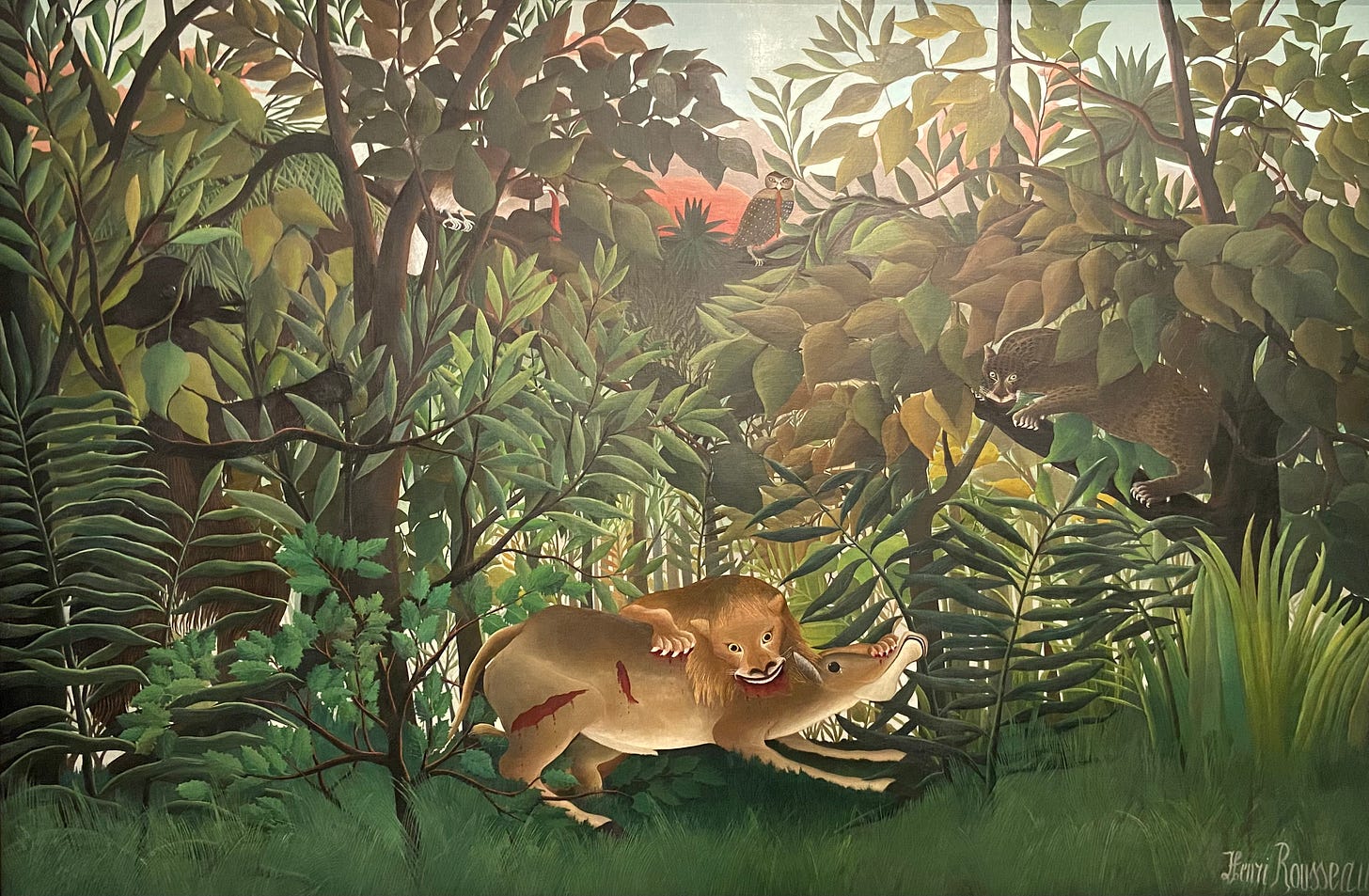 Rousseau’nun başyapıtları, hiç ayak basmadığı egzotik ormanlara açılan pencereler gibidir. Aslanlar, maymunlar, yılanlar, tukanlar, ışıltılı yapraklar ve gizemli bir renk cümbüşü…